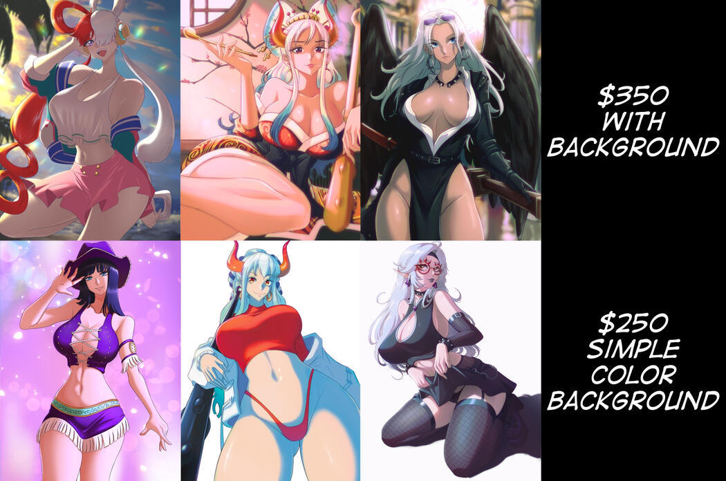 Commissions start at $250 for a single character and simple colour background, $350 for a detailed background instead